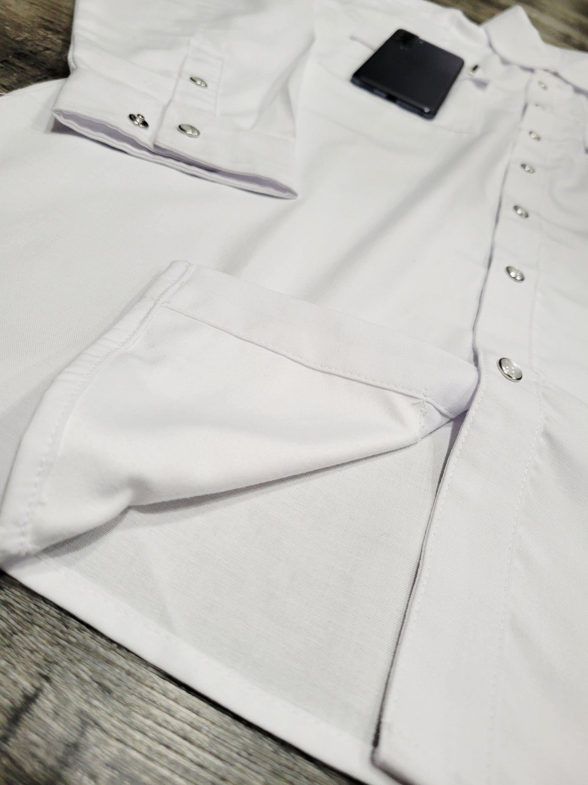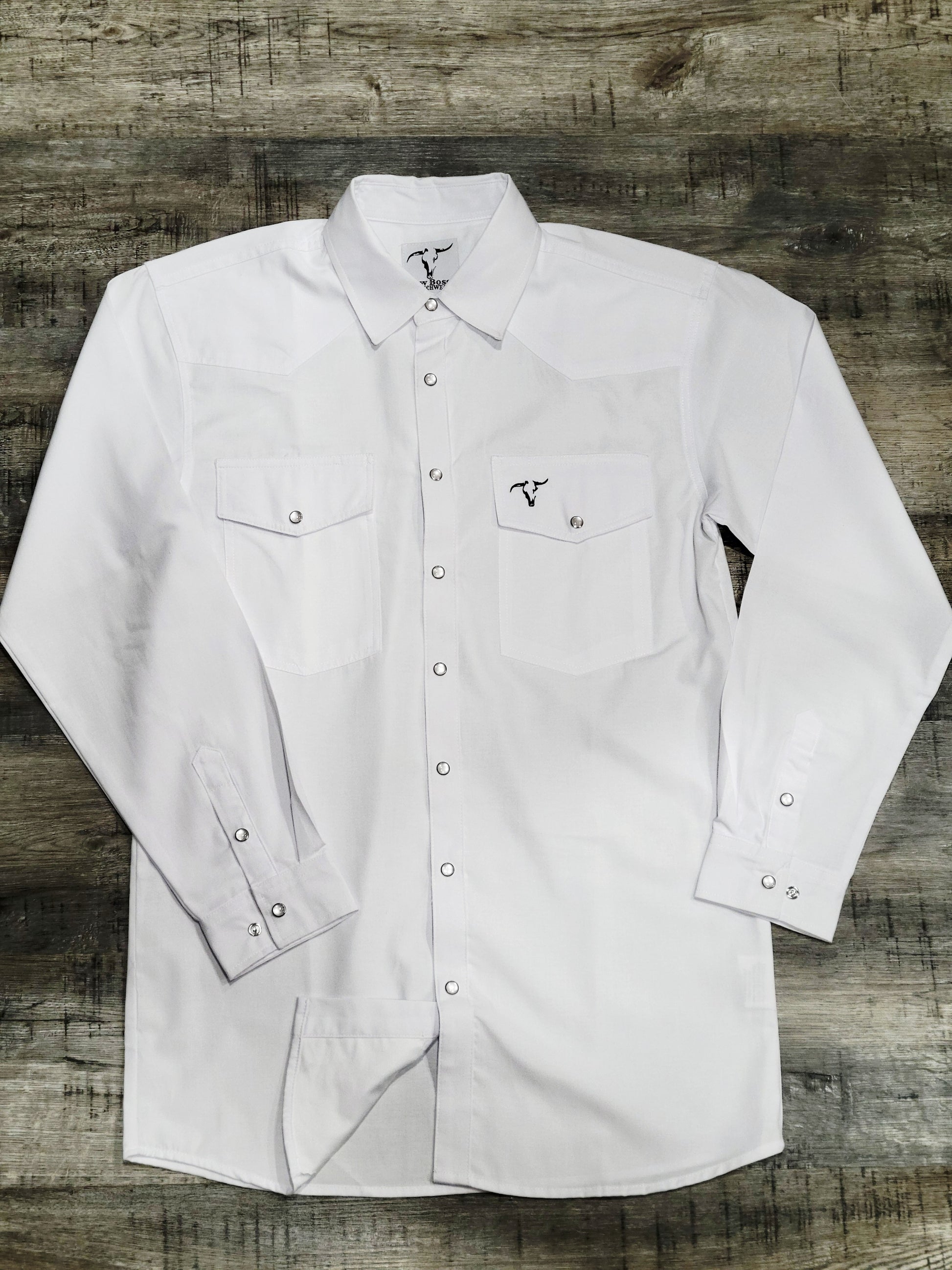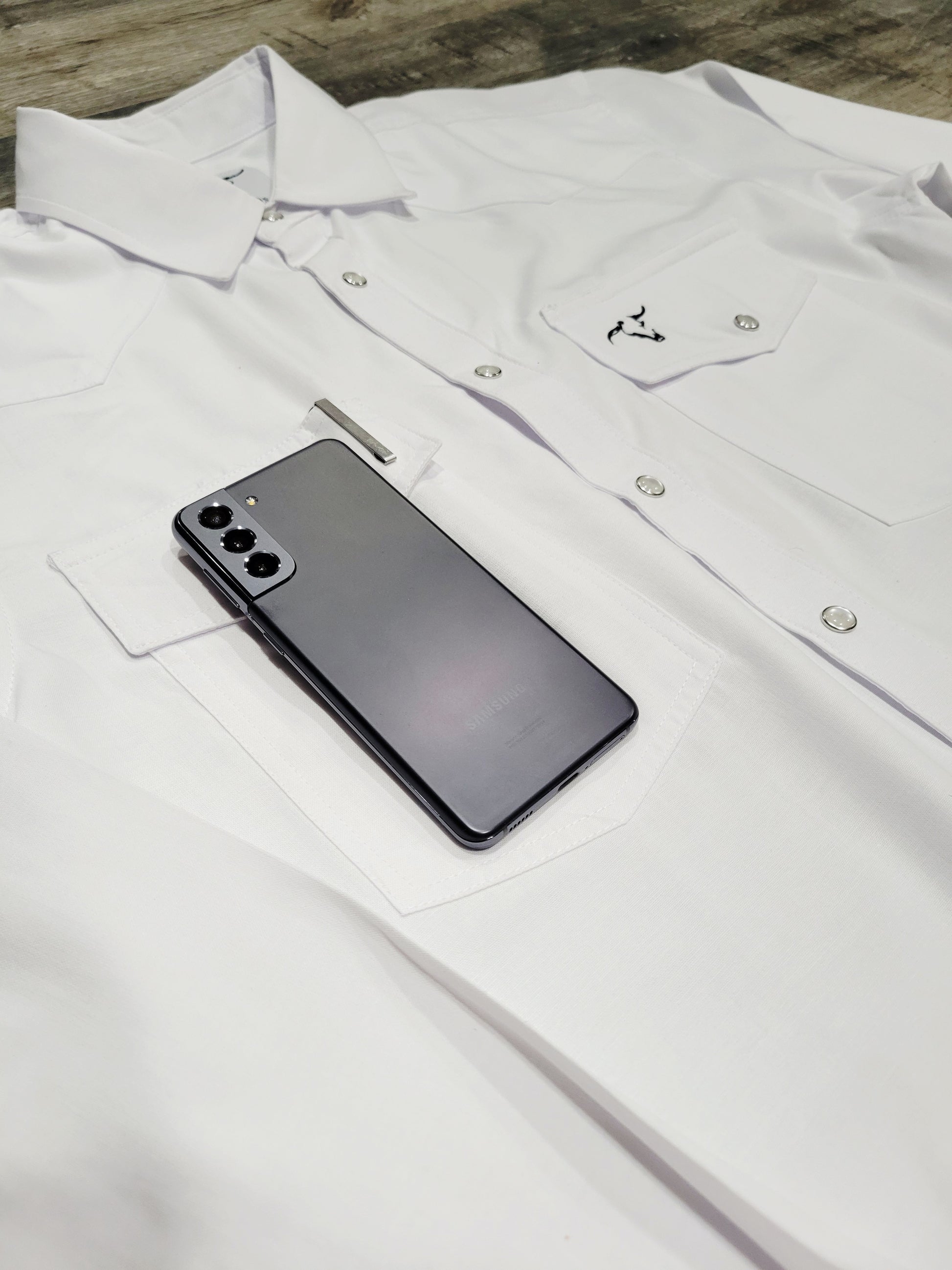 Same classic style as our "Big Sky" snap shirt, now in white. A 50% cotton 50% polyester blend chambray that is softer and more supple than most denims. This fabric is tough, flexible and dresses up or down. This shirt was made to solve a clear problem. The chest pocket had not changed sizes in 100 years, until we came along, that is! Smart phones and calving books need to be secure. Now they will be.
