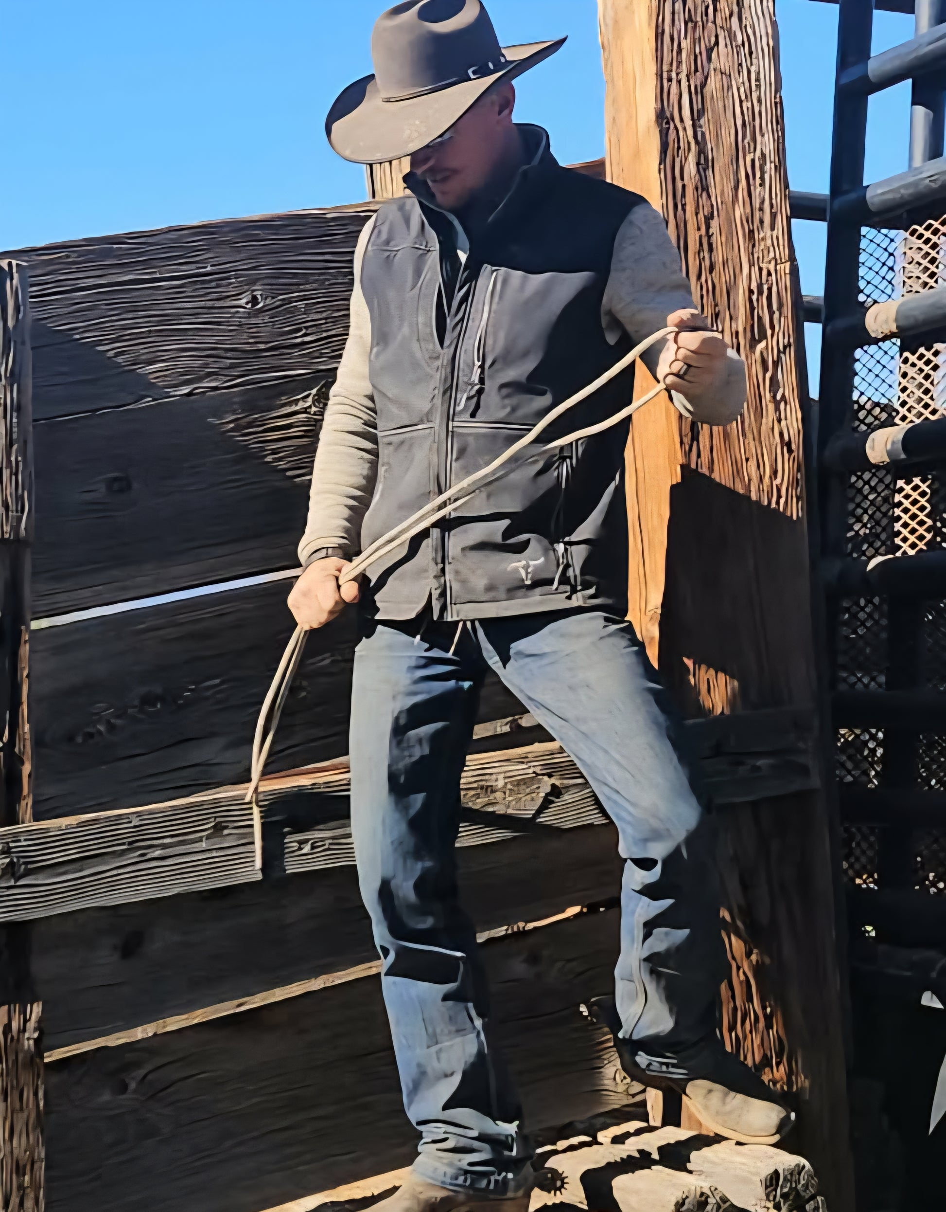 A mid-layer performance soft shell vest built to outlast the long days a cowboy endures.
